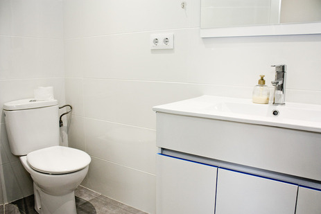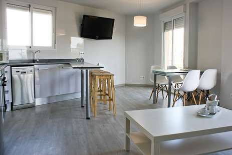 - cocina abierta equipada, con lavavajillas y barra americana con tres taburetes